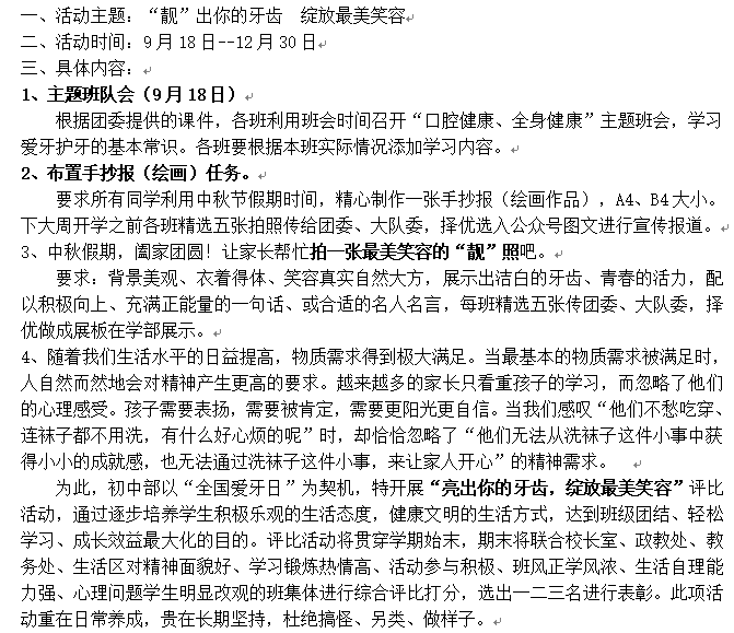 为了落实“双减”政策,促进学生身心健康成长,乐享一生健康生活,初中部特以“全国爱牙日”为契机,开展“'靓'出你的牙齿,绽放最美笑容”评比活动。通过逐步培养学生积极乐观的生活态度,健康文明的生活方式,达到班级团结、轻松学习、成长效益最大化的目的。评比活动将贯穿学期始末,期末将联合校长室、政教处、教务处、生活区对精神面貌好、学习锻炼热情高、活动参与积极、班风正学风浓、生活自理能力强、心理问题学生明显改观的班集体进行综合评比打分,选出一二三名进行表彰。